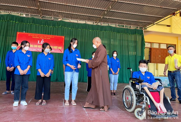 Nhằm hỗ trợ các em học sinh có hoàn cảnh khó khăn ở miền Tây xứ Nghệ, dịp này chùa Đại Tuệ (Nam Đàn) phối hợp cùng Quỹ học bổng Sen Vàng, chùa Diệc (TP Vinh) đã tổ chức trao tặng 100 suất học bổng cho các em học sinh nghèo vượt khó ở trường THPT Kỳ Sơn (huyện Kỳ Sơn) mỗi suất 500.000 đồng, tổng giá trị 50 triệu đồng.