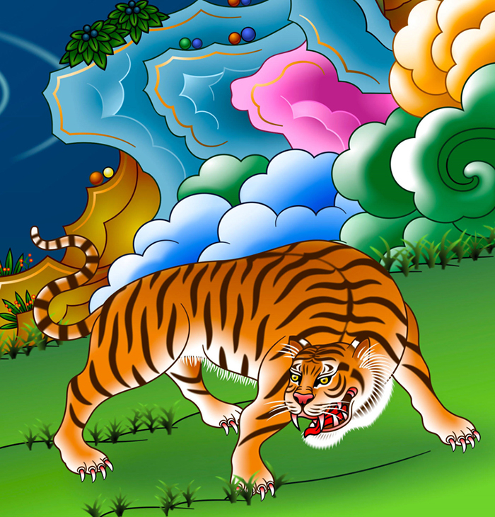 Trong tín ngưỡng, hổ trở thành hình tượng “ông ba mươi” trong tranh thờ làng Sình theo tập tục totem đã đi vào tiềm thức dân gian của nhiều dân tộc, nhất là những cộng đồng người nơi rừng sâu núi thẳm. Thần hổ trong truyền thuyết Việt là vị tướng họ Hùng có công đánh đuổi giặc Ân do bà mẹ hổ sinh ra mà cho đến tận ngày nay vẫn được hương khói phụng thờ khắp bốn mùa tại đền Trình ở danh thắng Hương Sơn, Mỹ Đức, Hà Nội cũng thuộc về tín ngưỡng. Giờ đây, bên thềm xuân Nhâm Dần, chúng ta thử cùng nhau đi tìm những chú hổ trong đạo Phật, nghe tiếng hổ gầm qua các trang kinh. Hình tượng hổ phiêu vọng vào các điển tích Phật giáo, ngàn luân…