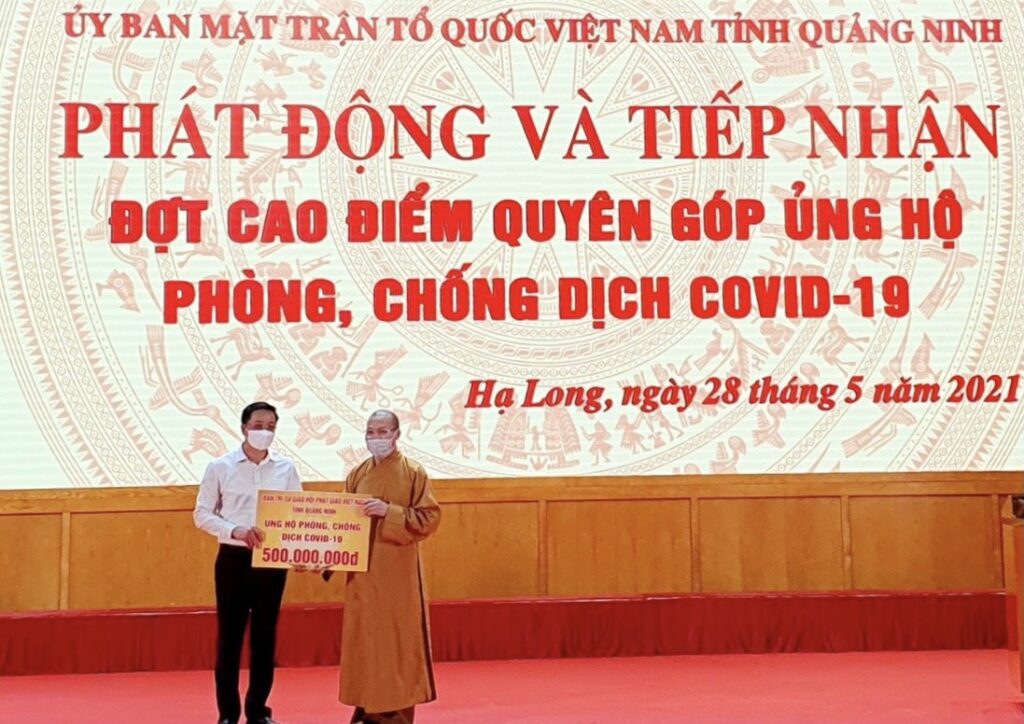 Ngay trong chiều ngày 28/5, tại Lễ phát động và tiếp nhận đợt cao điểm quyên góp ủng hộ phòng, chống dịch Covid-19 trên địa bàn tỉnh Quảng Ninh, đại diện Ban Trị sự, Thượng tọa Thích Thanh Lịch – Phó Trưởng ban Trị sự , Trưởng ban Từ thiện Giáo hội Phật giáo tỉnh Quảng Ninh đã trao số tiền 500 triệu đồng ủng hộ quỹ phòng, chống Covid-19 tới Ủy ban MTTQ VN tỉnh Quảng Ninh.