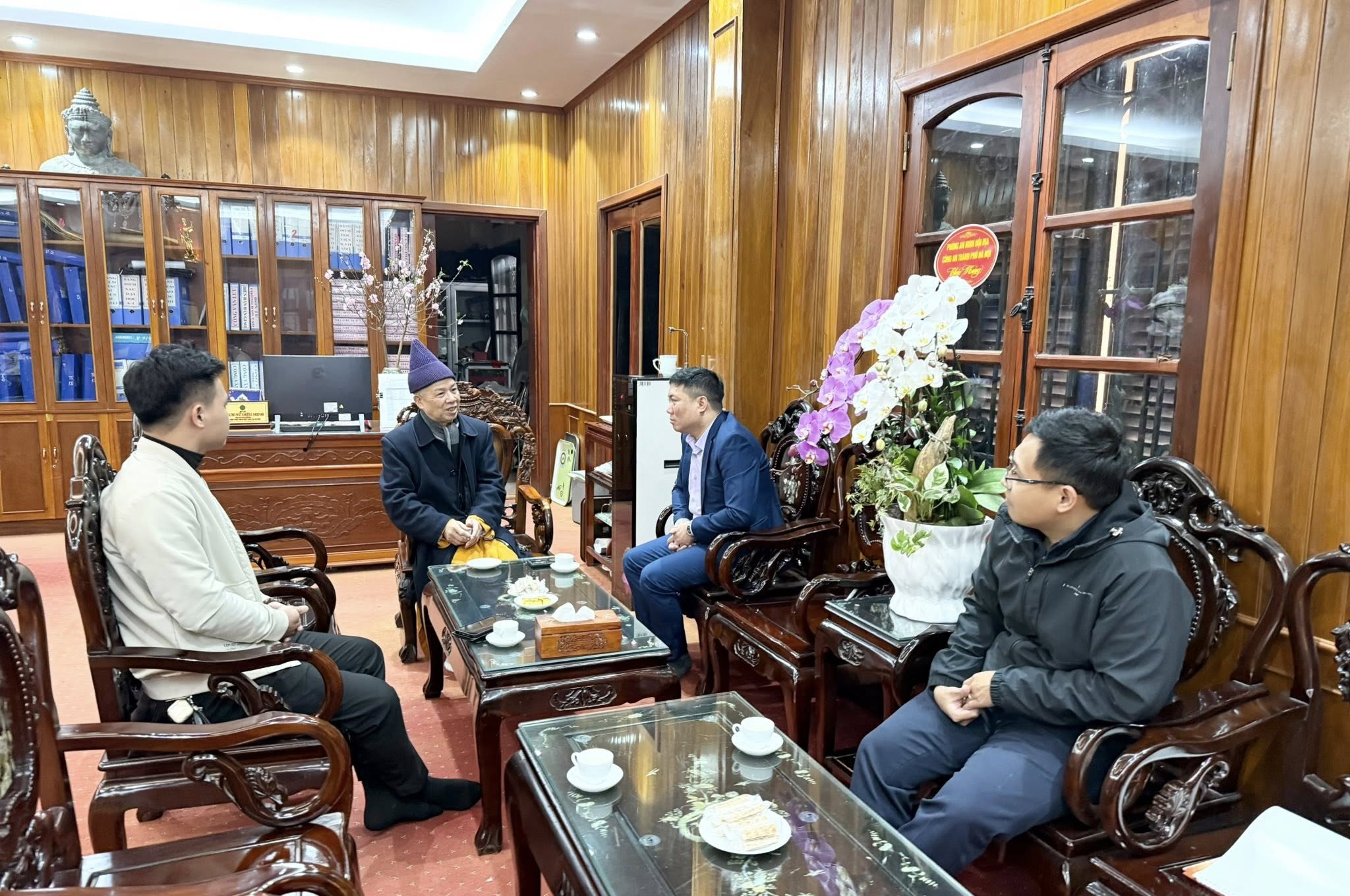 Sáng ngày 03/02/2026, Phòng An ninh nội địa – Công An Tp Hà Nội do Thượng tá Trần Tuấn Ngọc – Phó Trưởng phòng An ninh Nội địa, Công an Hà Nội làm trưởng đoàn đến thăm và chúc tết Hoà thượng Thích Thanh Quyết cùng chư Tôn đức Hội đồng Học viện.