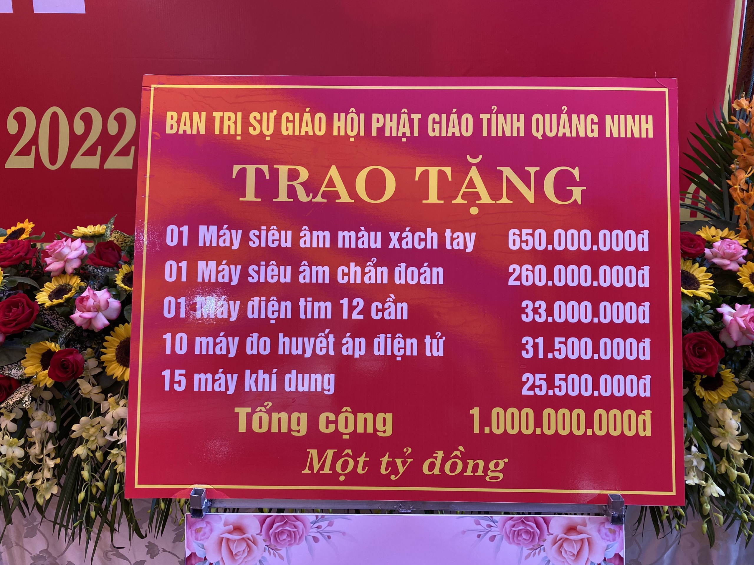 Được biết, số trang thiết bị y tế mà Giáo hội Phật giáo tỉnh Quảng Ninh trao tặng đợt này gồm: 01 máy siêu âm màu 650 triệu đồng; 01 máy siêu âm chuẩn đoán 260 triệu đồng; 01 máy điện tim 12 cần 33 triệu đồng; 10 máy đo huyết áp điện tử 31 triệu đồng; 15 máy khí dung 25,5 triệu đồng.