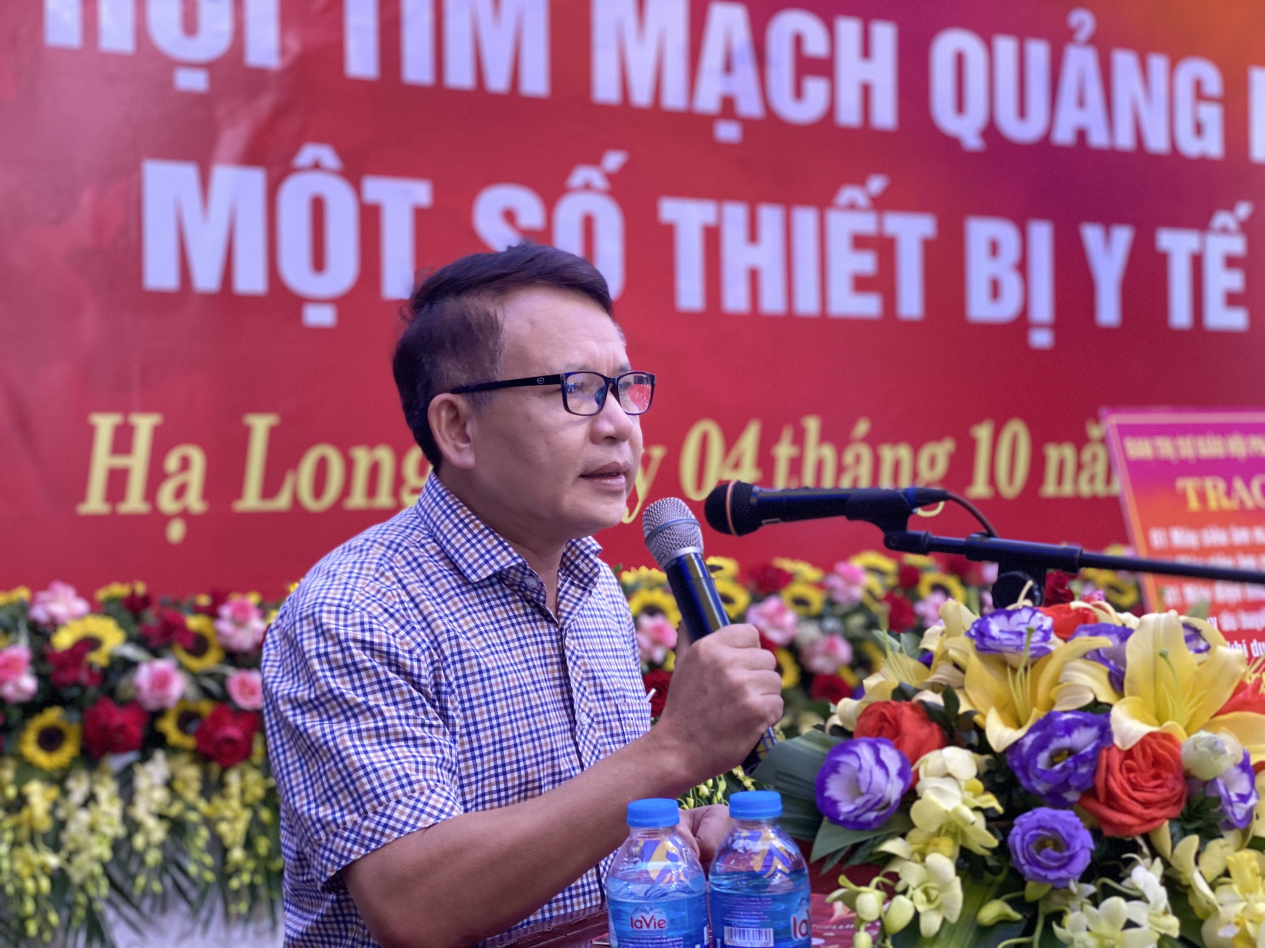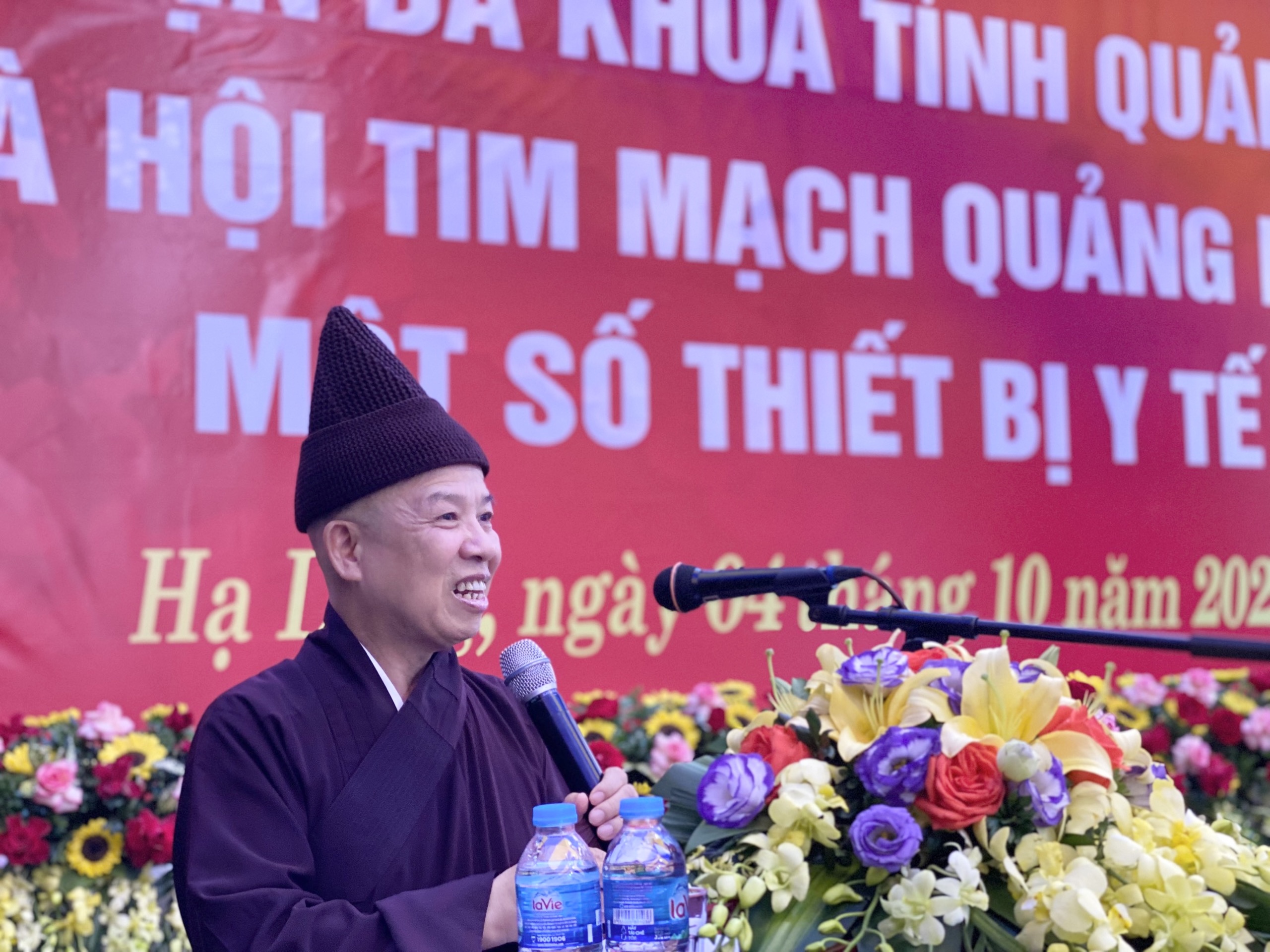 Thạc sĩ, Bác sĩ Nguyễn Thị Thoa – Trưởng Khoa tim mạch Bệnh viện tỉnh, Chủ tịch Hội tim mạch tỉnh Quảng Ninh( áo xanh) đã giới thiệu và cảm ơn Hoà thượng cùng Ban Trị sự.