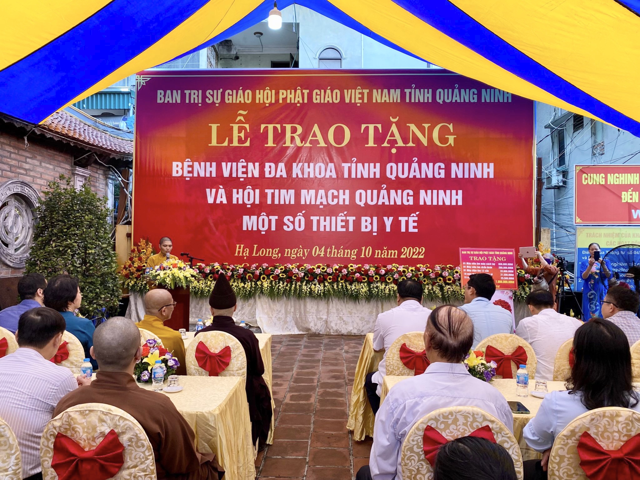 Chiều ngày 04/10/2022, tại Chùa Long Tiên – Phường Bạch Đằng, thành phố Hạ Long, Quảng Ninh, Ban Trị sự Giáo hội Phật giáo Việt Nam (GHPGVN) tỉnh Quảng Ninh đã tổ chức buổi lễ trao tặng trang thiết bị y tế cho Bệnh viện Đa khoa tỉnh và Hội tim mạch Quảng Ninh với tổng số tiền là 01 tỷ đồng.