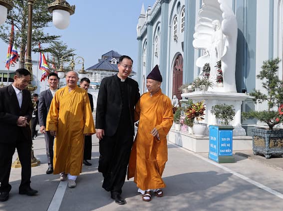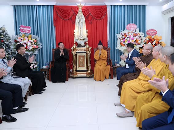 Hình ảnh Hoà thượng cùng Linh mục nắm tay cùng bước vào nhà thờ, thăm hang đá Chúa Giáng sinh thể hiện tinh thần đoàn kết, gắn bó giữa các tôn giáo, cùng nhau chung tay xây dựng quê hương đất nước ngày một văn minh giàu mạnh.