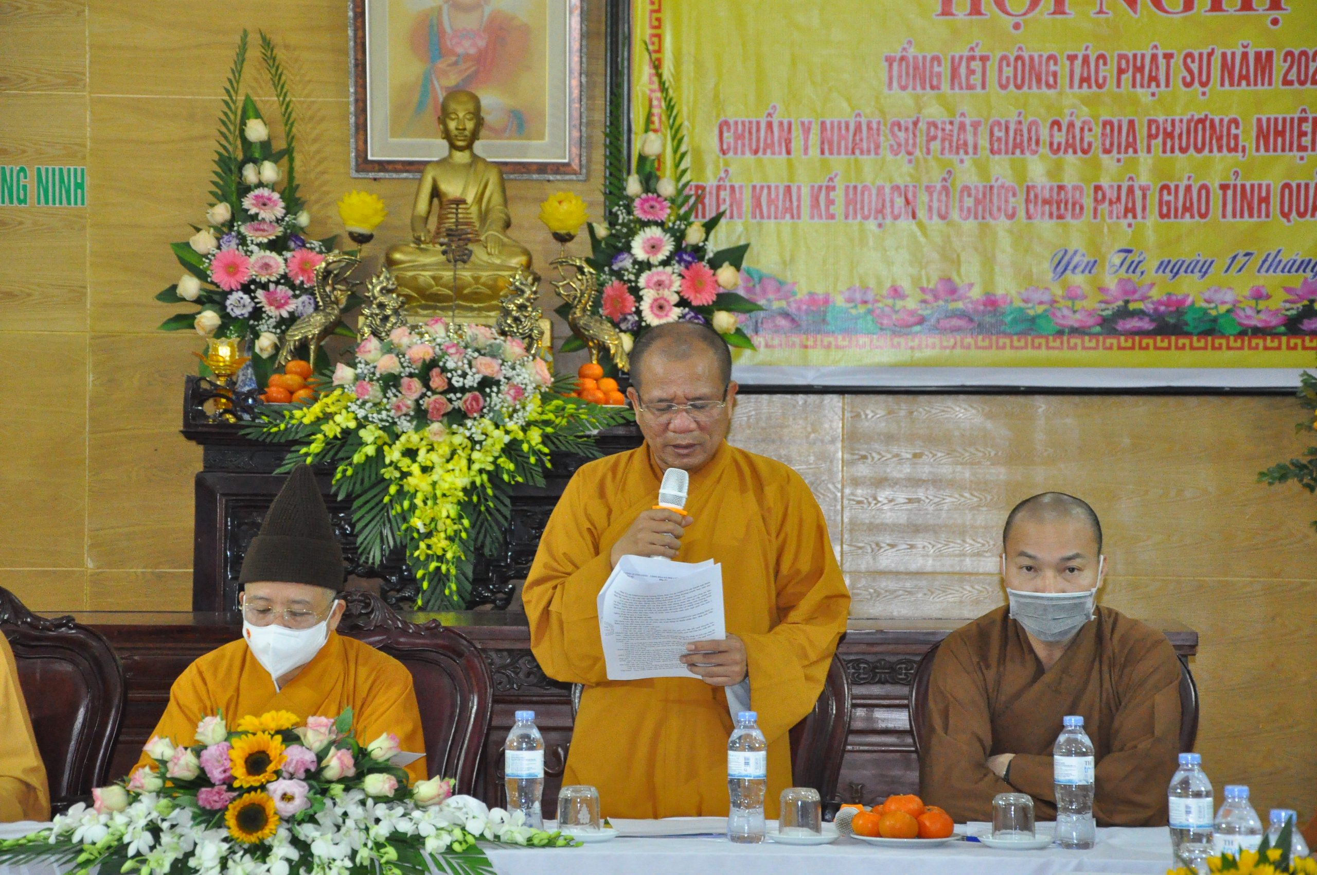 Phát biểu chỉ đạo hội nghị, Hòa thượng Thích Thanh Quyết- Phó Chủ tịch HĐTS, Trưởng ban Trị sự GHPG tỉnh Quảng Ninh ghị nhận những kết quả mà Tăng Ni, Phật tử tỉnh Quảng ninh trong năm vừa qua. Về kế hoạch triển khai tổ chức Đại hội Phật giáo tỉnh sắp tới đây, Hòa thượng yêu cầu cần xây dựng kế hoạch tổ chức cụ thể, tiết kiệm và đảm bảo công tác phòng chống dịch, đồng thời chú trọng công tác từ thiện nhân đạo trong dịp này.