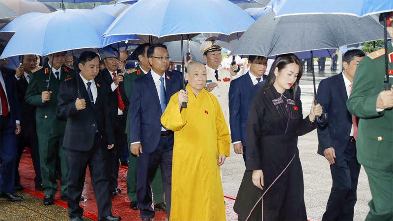 Đúng 7 giờ 15 phút, Lãnh đạo Đảng, Nhà nước, Mặt trận Tổ quốc Việt Nam, Chư tôn đức và các đại biểu Quốc hội đặt vòng hoa vào Lăng viếng Chủ tịch Hồ Chí Minh.