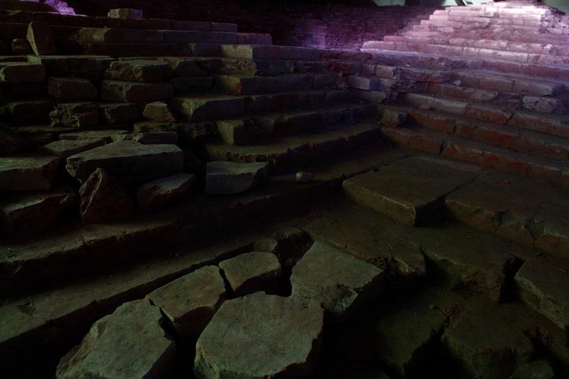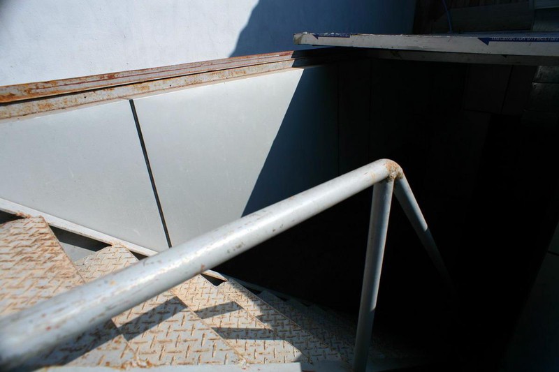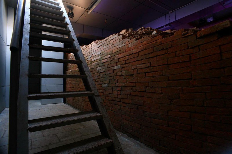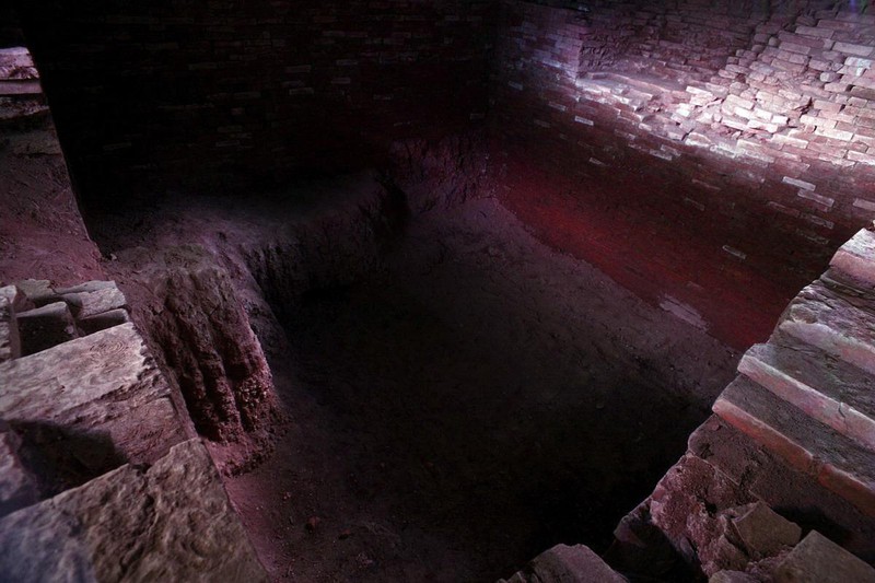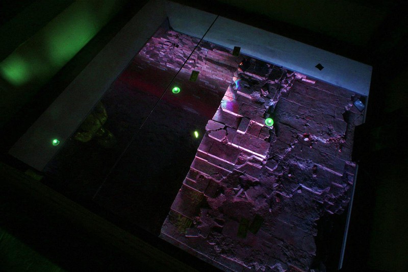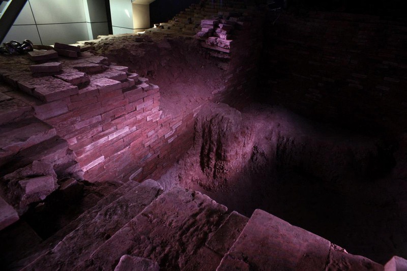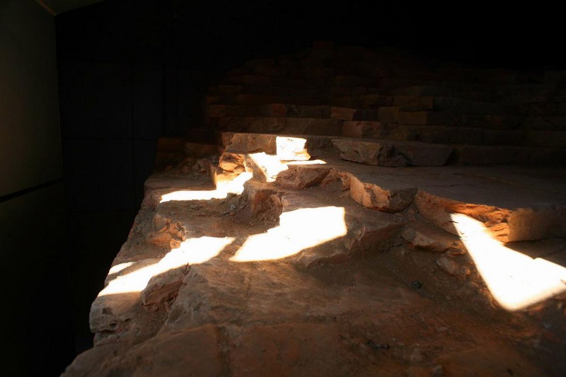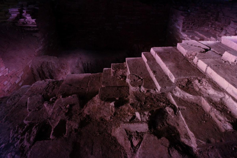 Các chuyên gia đã nhất trí bảo tồn di tích này bằng một phương pháp táo bạo, đó là xây dựng chùa mới phía trên nhưng vẫn bảo toàn nguyên vẹn nền móng tháp bằng một khu vực bảo tồn và trưng bày trong lòng đất. Ảnh: Lối xuống khu hầm bảo tồn nằm ở khoảng sân phía ngoài Tam bảo.