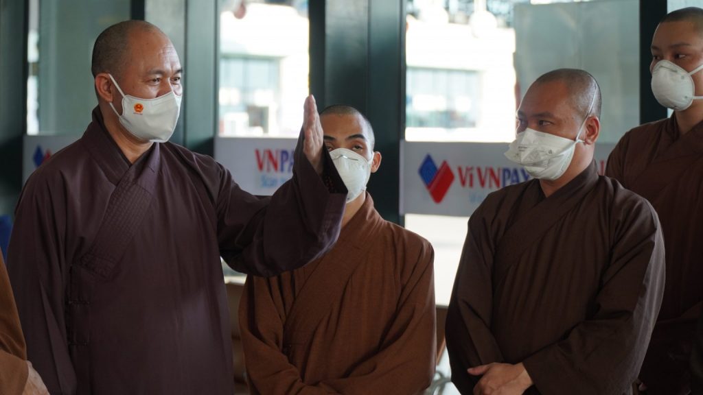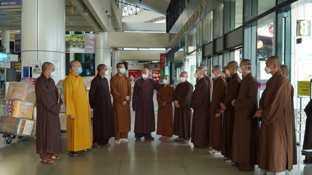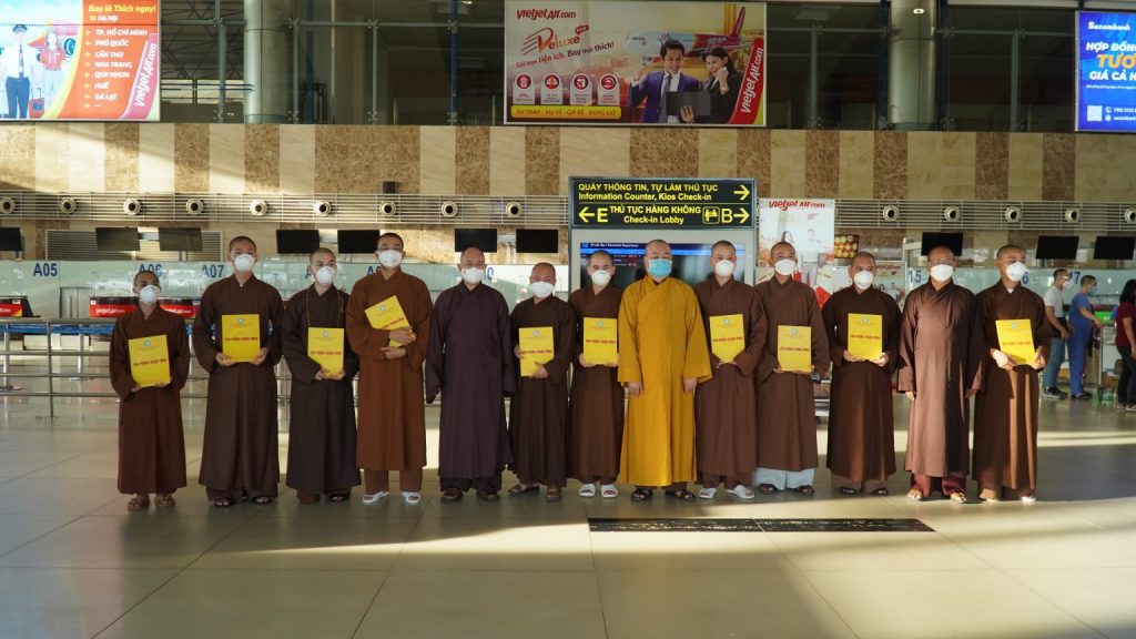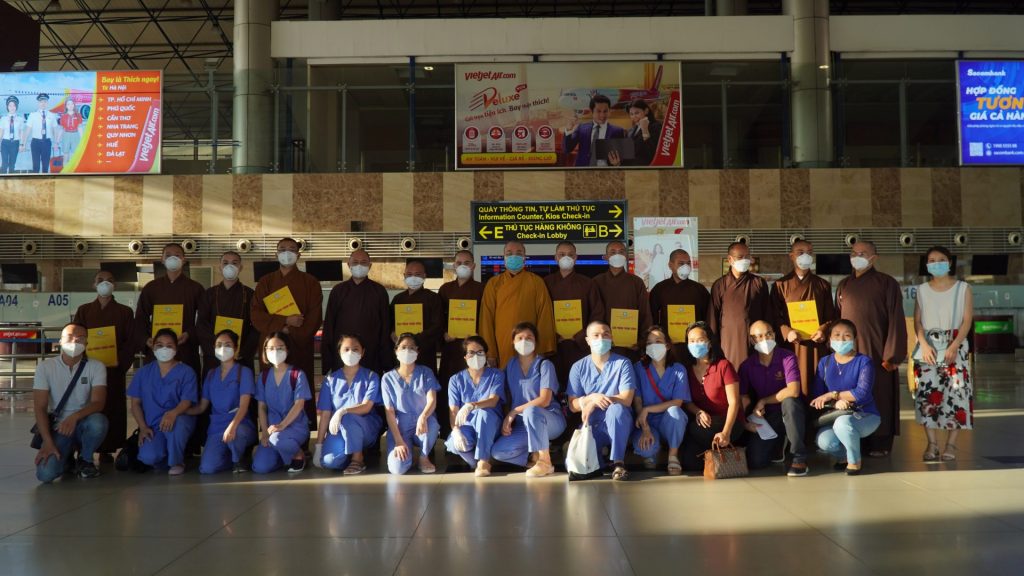 HT. Thích Thanh Nhiễu, Phó Chủ tịch Thường trực HĐTS GHPGVN; TT. Thích Quảng Hà, Phó Chủ tịch HĐTS GHPGVN; TT. Thích Đức Thiện, Phó chủ tịch – Tổng thư ký HĐTS GHPGVN đã ra tận sân bay Nội Bài tiếp tục tiễn 10 vị Tăng tình nguyện vào miền Nam tham gia tuyến đầu hỗ trợ phòng, chống dịch.