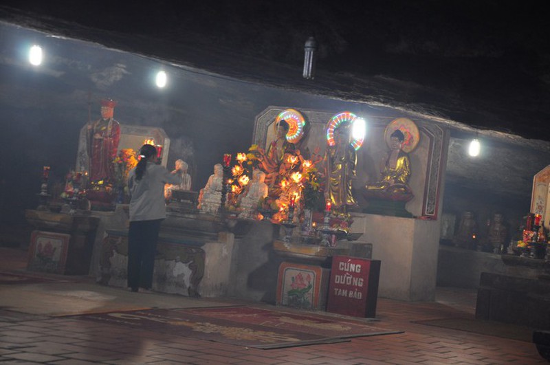 “Ngày xưa, ở chính giữa hang đã có đặt bàn thờ Tam thế Phật là Phật A di đà, Phật tổ Như Lai và Phật Di lặc. Bên trái bàn thờ có bàn thờ Tổ sư Đạt ma với bài vị bằng gỗ sơn son thếp vàng trên đó ghi rõ “Phụng tự Tây phương Đông Độ lịch đại tổ sư chi linh vị”, ông Dự cho biết.