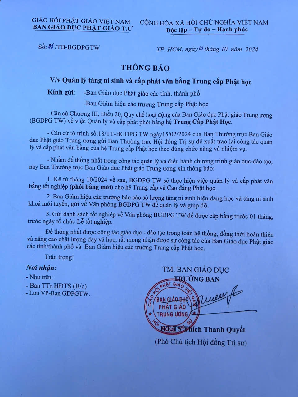 Thông báo về việc Quản lý tăng ni sinh và cấp phát văn bằng Trung cấp Phật học