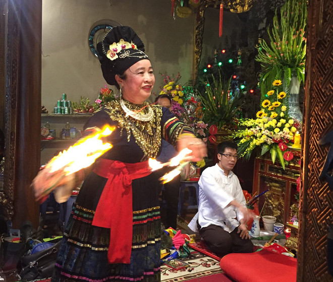 Còn ở tiến trình Lên đồng – Thực hành tín ngưỡng thờ Mẫu Tam Tứ Phủ, khi những thanh đồng, Cô (Cậu) đồng, trong tiếng nhạc lời ca Hát văn – Chầu văn của các Cung văn, trịnh trọng và thoăn thoắt thay đổi các bộ trang phục rực rỡ với 3-4 màu nền: đỏ, trắng, vàng, xanh, tượng trưng/thuộc về các Thiên Phủ, Thoải Phủ, Địa Phủ, Nhạc Phủ, mà múa nhảy để hóa thân thành Tam tòa – Tứ vị Thánh Mẫu, Ngũ vị Quan Lớn, Tứ vị Chầu Bà, các Ông Hoàng Bơ, Hoàng Bảy, Hoàng Mười…, các Cô Đệ Nhất, Cô Đôi, Cô Bơ…, các Cậu Bơ, Cậu Bé…, thì lúc ấy, Tín ngưỡng thờ Mẫu Tam Phủ cũng đã thực tế tích hợp về/kết hợp được với vô số những vùng miền truyền thuyết, lịch sử, văn hóa dân gian… từ thời nguyên thủy, đời Hùng Vương, giai đoạn Lam Sơn khởi nghĩa, ở hết miền rừng xanh Bắc Lệ lại đến vùng sông nước Ninh Giang, của cả đồng bào các dân tộc Nùng, Dao… nữa.