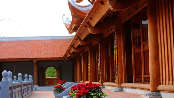 Nghệ thuật chạm khắc gỗ truyền thống của cha ông, với những đường nét tinh xảo hiếm nơi nào có được là điểm nhấn làm nên giá trị của công trình hoành tráng này. Bộ khung gỗ mái dạng “giá chiêng, chồng rường” và các họa tiết trang trí, tạo hình hoa sen, vân mây được cách điệu tinh tế, thể hiện óc sáng tạo, sự tài hoa và tỉ mỉ trong từng chi tiết của các nghệ nhân điêu khắc làm nên công trình này.