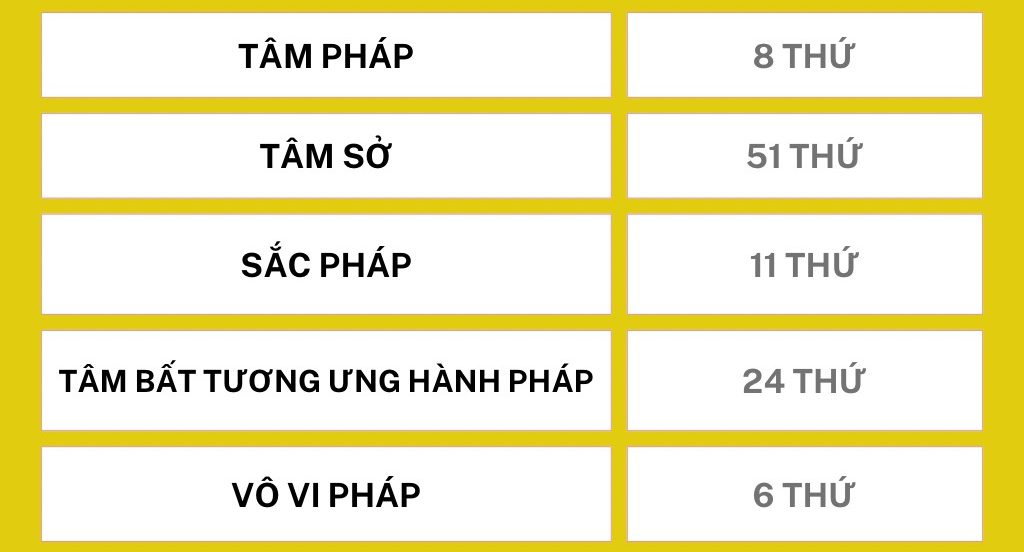 Duy Thức tóm gọn tất cả các pháp thế gian thành “100 pháp” được phân loại theo số lượng và vào các đề mục như sau: