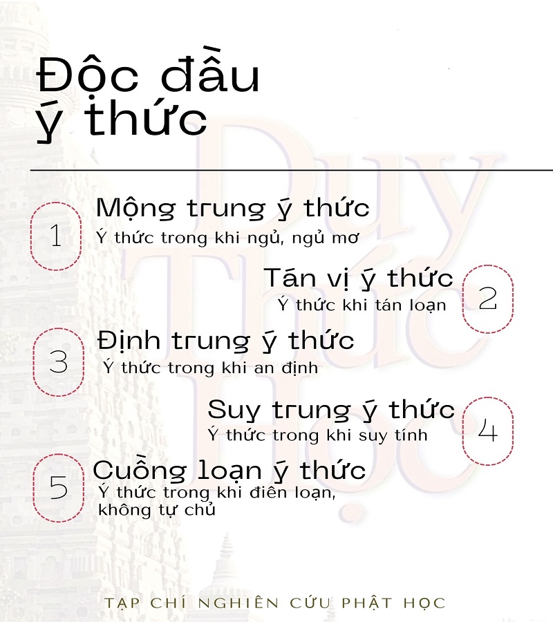 Cụ thể là ví dụ như khi mắt không thấy bố mẹ mình, nhưng vẫn khởi lên suy nghĩ, hình ảnh về bố mẹ. Đó là do sự hoạt động độc lập của Ý thức khởi lên các vọng tưởng dù cho hiện tại hiện hữu này không có điều đó. Độc đầu ý thức hoạt động qua 5 trạng thái: