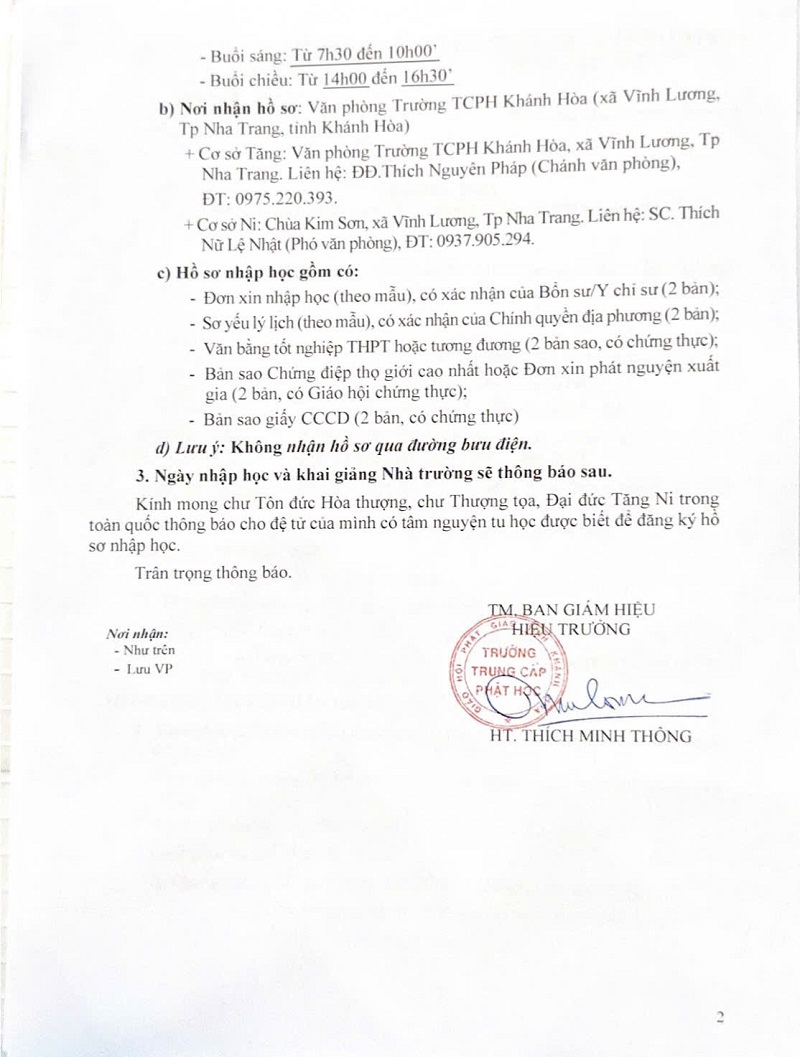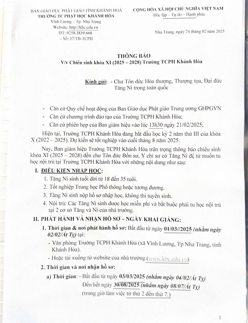 Trường Trung cấp Phật học Khánh Hòa chiêu sinh Khóa XI (2025-2028)