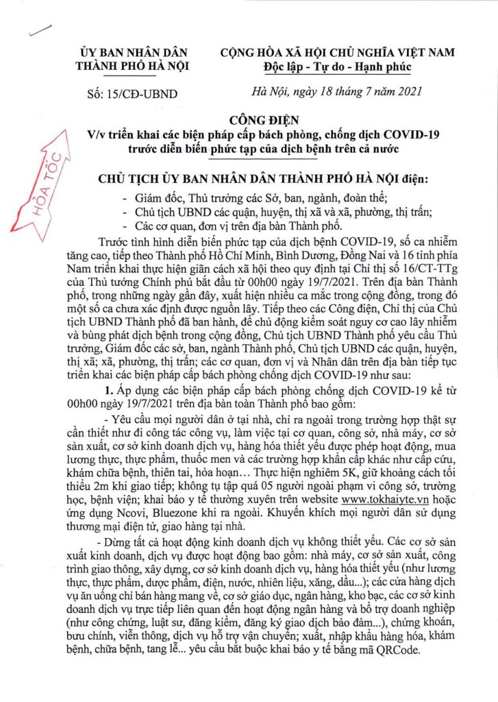 Ngày 18/7, Chủ tịch UBND TP Hà Nội Chu Ngọc Anh đã ký ban hành Công điện số 15/CĐ-CTUBND về việc triển khai các biện pháp cấp bách phòng, chống dịch Covid-19 trước diễn biến phức tạp của dịch bệnh trên cả nước.
