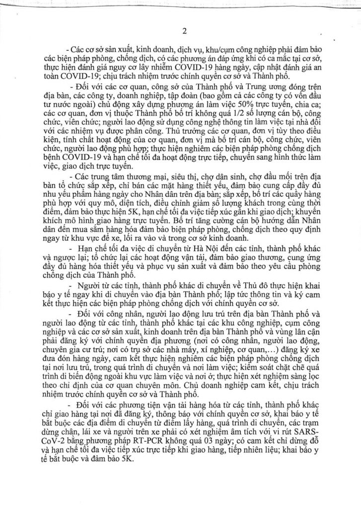 Đối với các cơ quan, công sở của thành phố và Trung ương đóng trên địa bàn, các công ty, doanh nghiệp, tập đoàn (bao gồm cả các công ty có vốn đầu tư nước ngoài) chủ động xây dựng phương án làm việc 50% trực tuyến, chia ca; các cơ quan, đơn vị thuộc thành phố bố trí không quá 1/2 số lượng cán bộ, công chức, viên chức; người lao động sử dụng công nghệ thông tin làm việc tại nhà đối với các nhiệm vụ được phân công. Thủ trưởng các cơ quan, đơn vị tùy theo điều kiện, tính chất hoạt động của cơ quan, đơn vị mà bố trí cán bộ, công chức, viên chức, người lao động phù hợp; thực hiện nghiêm các biện pháp phòng chống dịch bệnh Covid-19 và hạn chế tối đa hoạt động trực tiếp, chuyển sang hình thức làm việc, giao dịch trực tuyến.