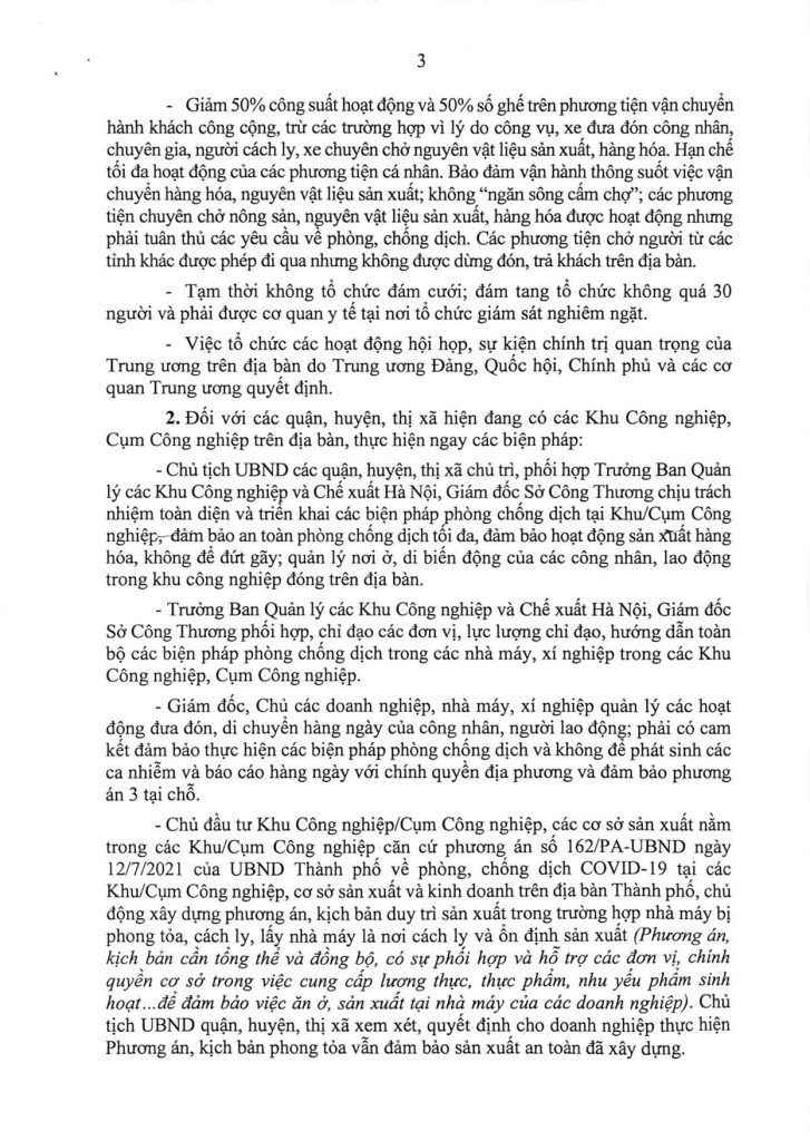 Đối với các quận, huyện, thị xã hiện đang có các Khu Công nghiệp, Cụm Công nghiệp trên địa bàn, Chủ tịch UBND các quận, huyện, thị xã chủ trì, phối hợp Trưởng Ban Quản lý các Khu Công nghiệp và Chế xuất Hà Nội, Giám đốc Sở Công Thương chịu trách nhiệm toàn diện và triển khai các biện pháp phòng chống dịch tại Khu/Cụm Công nghiệp, bảo đảm an toàn phòng chống dịch tối đa, đảm bảo hoạt động sản xuất hàng hóa, không để đứt gãy; quản lý nơi ở, di biến động của các công nhân, lao động trong khu công nghiệp đóng trên địa bàn.