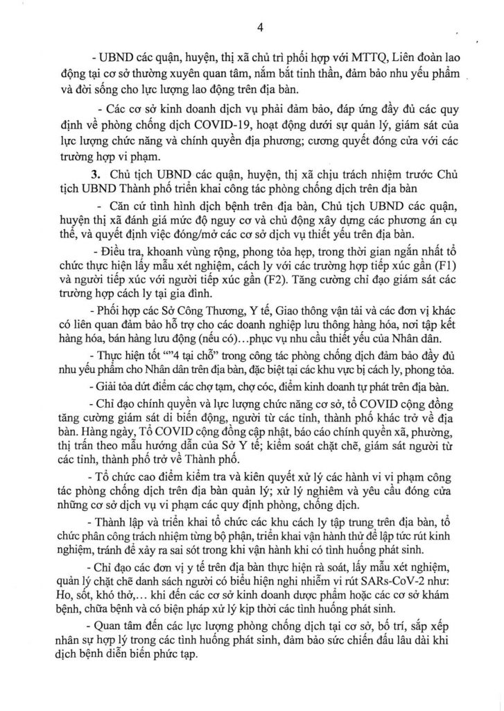 UBND thành phố cũng giao nhiệm vụ cho Chủ tịch UBND các quận, huyện, thị xã và Thủ trưởng các sở, ban, ngành thành phố. Trong đó, Chủ tịch UBND các quận, huyện, thị xã tổ chức cao điểm kiểm tra và kiên quyết xử lý các hành vi vi phạm công tác phòng chống dịch trên địa bàn quản lý; xử lý nghiêm và yêu cầu đóng cửa những cơ sở dịch vụ vi phạm các quy định phòng, chống dịch.