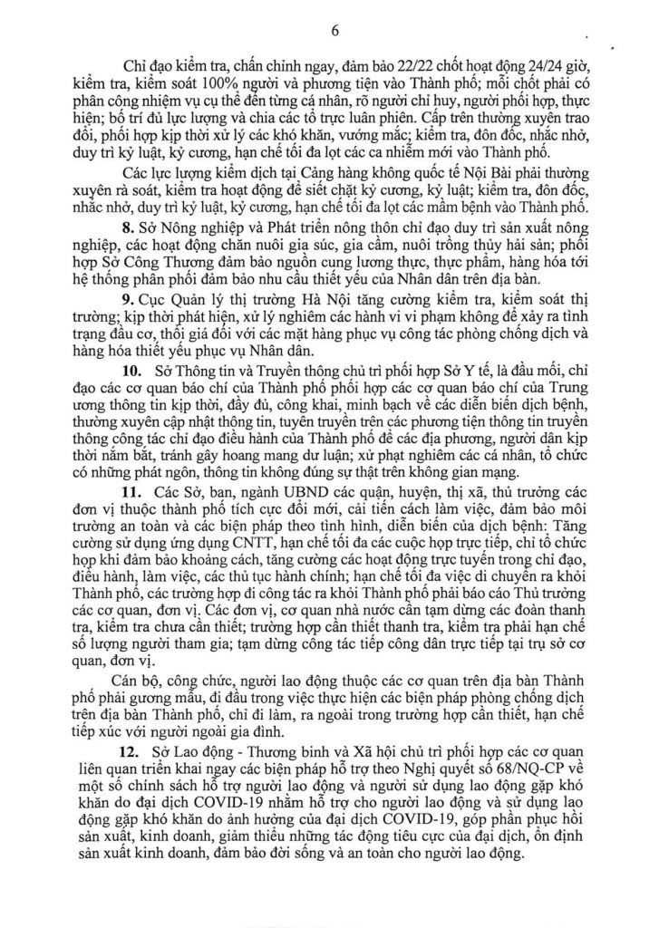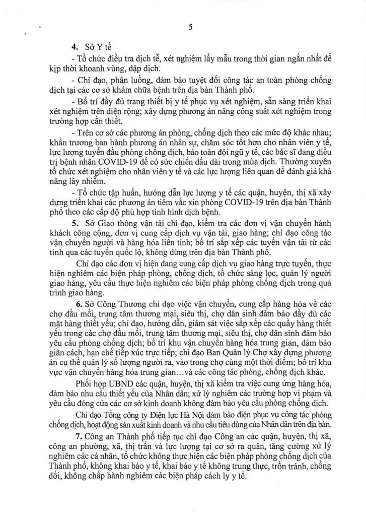 Sở Công Thương được giao chỉ đạo việc vận chuyển, cung cấp hàng hóa về các chợ đầu mối, trung tâm thương mại, siêu thị, chợ dân sinh đảm bảo đầy đủ các mặt hàng thiết yếu; Cục Quản lý thị trường Hà Nội chỉ đạo xử lý các hành vi găm hàng, tăng giá, gây bất ổn thị trường theo đúng quy định của pháp luật..