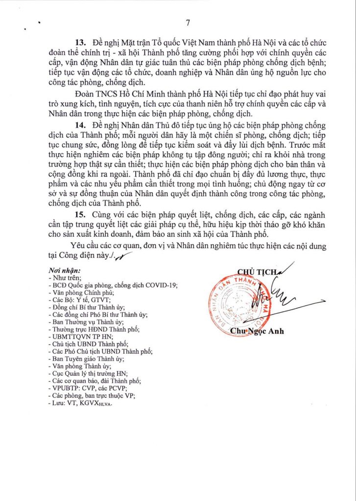 Chủ tịch UBND thành phố Chu Ngọc Anh đề nghị nhân dân Thủ đô tiếp tục ủng hộ các biện pháp phòng chống dịch của Thành phố; mỗi người dân hãy là một chiến sĩ phòng, chống dịch; tiếp tục chung sức, đồng lòng để tiếp tục kiểm soát và đẩy lùi dịch bệnh. Trước mắt thực hiện nghiêm các biện pháp không tụ tập đông người; chỉ ra khỏi nhà trong trường hợp thật sự cần thiết; thực hiện các biện pháp phòng dịch cho bản thân và cộng đồng khi ra ngoài.