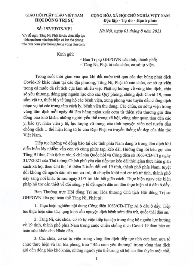 Hòa thượng Thích Thiện Nhơn, Chủ tịch Hội đồng Trị sự GHPGVN ấn ký gửi đến Ban Trị sự GHPGVN các tỉnh, thành phố; Tăng Ni, Phật tử các chùa, cơ sở tự viện, “đề nghị Tăng Ni, Phật tử các chùa tiếp tục tích cực hơn nữa thực hiện và lan tỏa phong trào bữa cơm yêu thương trong vùng tâm dịch”.