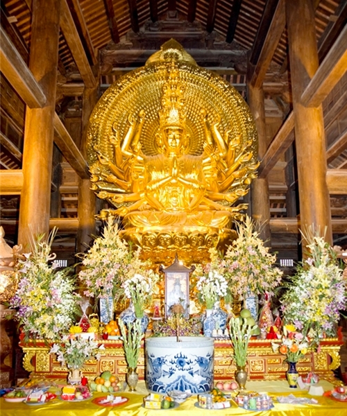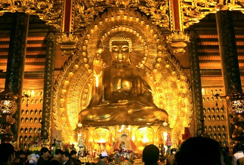 1. Tượng Phật Thích Ca bằng đồng dát vàng, tượng Phật Di Lặc bằng đồng, tượng Phật Quan Thế Âm nghìn mắt, nghìn tay bằng đồng dát vàng lớn nhất Việt Nam ở chùa Bái Đính – Ninh Bình.