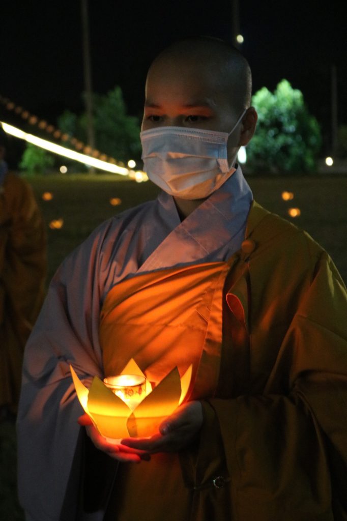 Tứ trọng ân trong Phật giáo đó là: Ân trời đất; ân quốc gia; ân thầy tổ, thầy dạy, và cha mẹ, ông bà; ân đồng bào, xã hội. Tứ trọng ân đã trở thành nguồn sống tinh thần trong tâm thức con người: Tri ân và báo ân. Khi đất nước khó khăn đối phó với đại dịch Covid-19, tăng ni sinh Học viện thực hiện nghiêm các chủ trương của Giaó hội, Chính phủ, “ai ở đâu, ở yên đó”, tích cực kêu gọi bà con phật tử tham gia công tác thiện nguyện và đã có hàng trăm tăng ni sinh viết đơn phát nguyện tham gia tuyến đầu chống dịch. Tại lễ Vu Lan báo hiếu đêm nay, họ đã thắp lên những ngọn nến với lòng thành kính tri ân đến sự hy sinh của các anh hùng liệt sỹ.